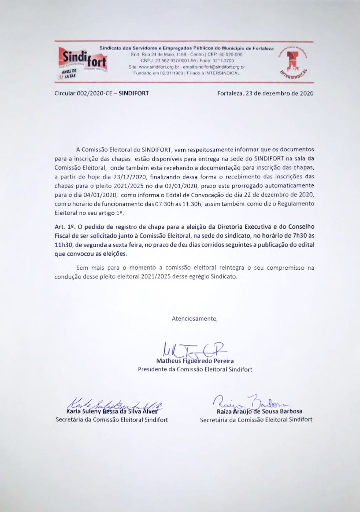 A Comissão Eleitoral do SINDIFORT, vem respeitosamente informar que os documentos para a inscrição das chapas estão disponíveis para entrega na sede do SINDIFORT na sala da Comissão Eleitoral, onde também está recebendo a documentação para inscrição das chapas, a partir de hoje dia 23/12/2020, finalizando dessa forma o recebimento das inscrições das chapas para o pleito 2021/2025 no dia 02/01/2020, prazo este prorrogado automaticamente para o dia 04/01/2020, como informa o Edital de Convocação do dia 22 de dezembro de 2020, com o horário de funcionamento das 07:30h as 11:30h, assim também como diz o Regulamento Eleitoral no seu artigo 12.