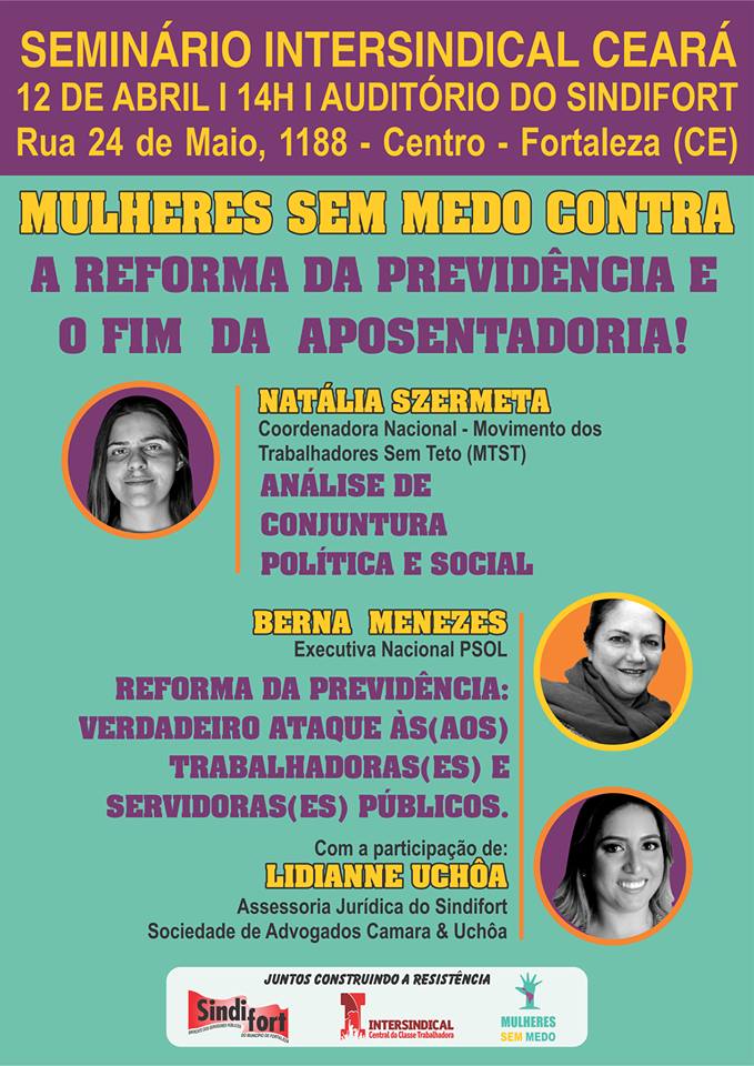 Nesta sexta-feira, 12 de abril, o auditório do Sindifort recebe o Seminário Mulheres Sem Medo: Contra a Reforma da Previdência e o Fim da Aposentadoria! Com realização da Intersindical Central da Classe Trabalhadora e da Frente POVO SEM MEDO, participam do evento Natália Szermeta, coordenadora nacional do MTST; Berna Menezes, membro da Executiva Nacional do PSOL; e Lidianne Uchôa, assessora jurídica do Sindifort. Seminário acontece de a partir das 14h.