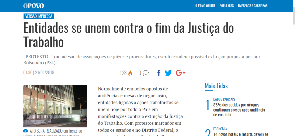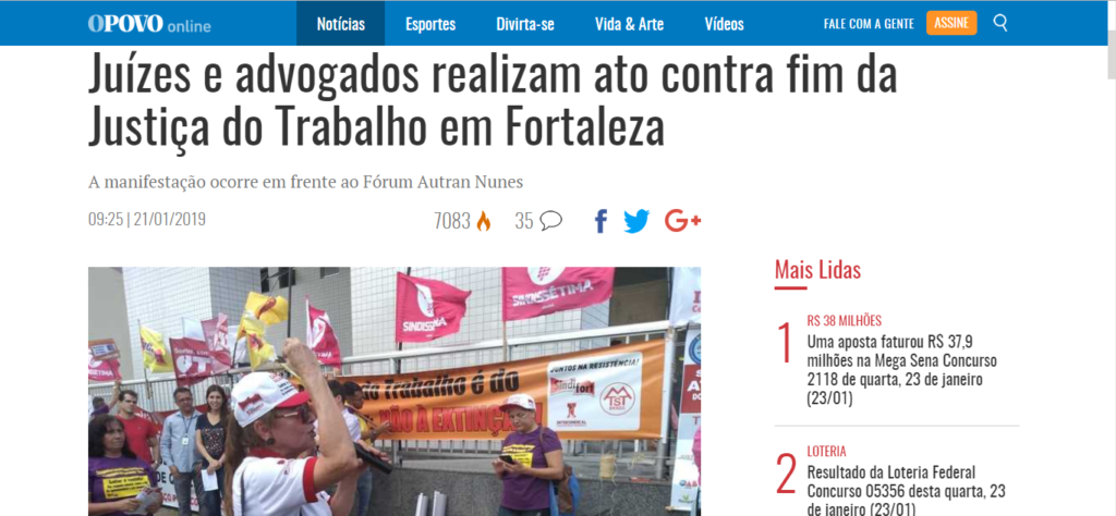 Um ato contra o fim da Justiça do Trabalho foi realizado no dia 21, segunda-feira, com a participação do Sindifort e diversas outras entidades. A manifestação foi destaque em vários portais de mídia cearense. Confira: