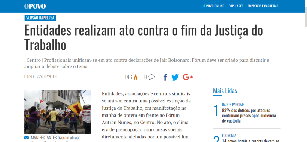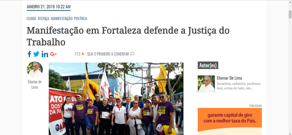 Um ato contra o fim da Justiça do Trabalho foi realizado no dia 21, segunda-feira, com a participação do Sindifort e diversas outras entidades. A manifestação foi destaque em vários portais de mídia cearense. Confira: